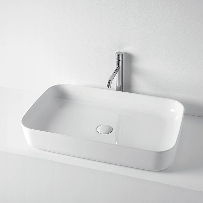 Прямоугольная накладная раковина для ванной комнаты из коллекции Tribeca от бренда Kerasan. Модель предназначена для установки на готовую тумбу и подходит для комплектации современных санузлов.