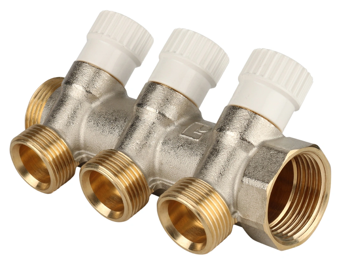 Компактные размеры и продуманная конструкция облегчают установку в коллекторный шкаф. Все выходы оснащены евроконусами под опрессовку металлопластиковой или PE-X трубы, что обеспечивает быстрый и надежный монтаж без дополнительных переходников. Прямые участки резьбы между отводами упрощают аккуратную разводку труб.