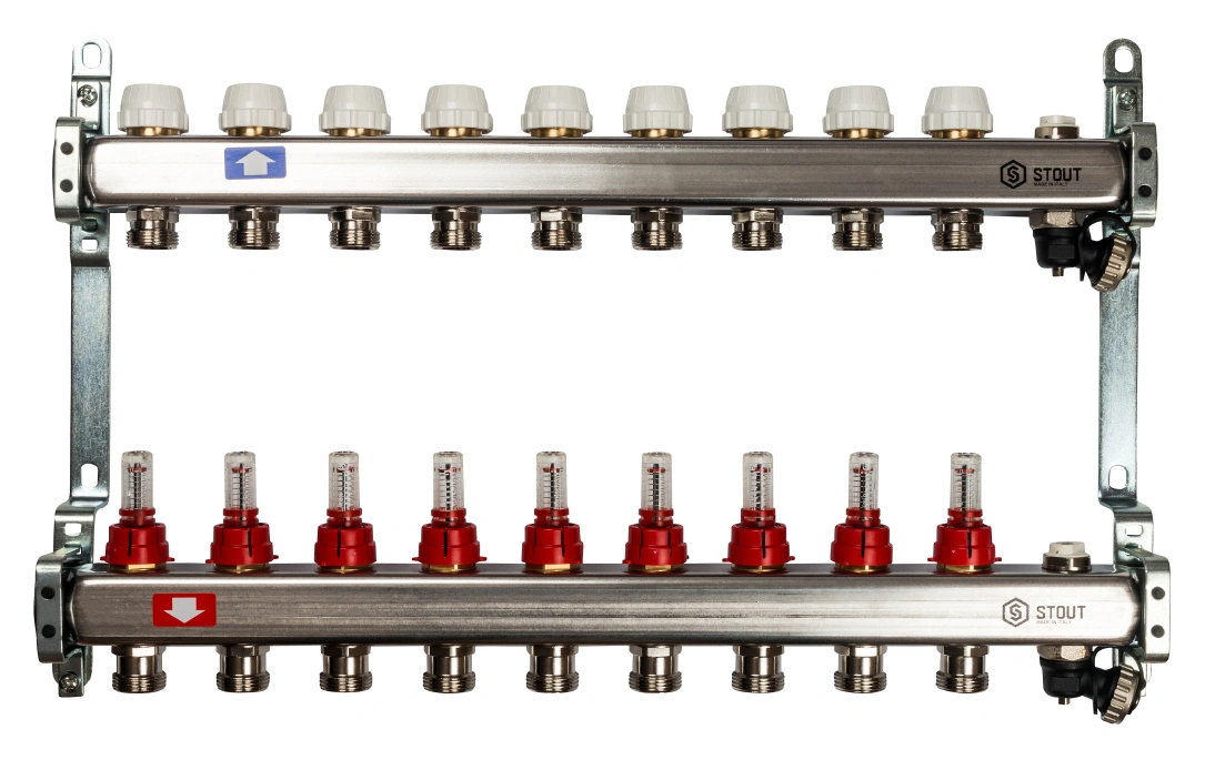 Коллектор STOUT на 9 контуров - это готовое, сбалансированное решение для профессионального монтажа системы теплого пола. Встроенные расходомеры и запорная арматура экономят время на сборку, предоставляя инструмент для точной настройки и дальнейшего удобного управления отоплением.