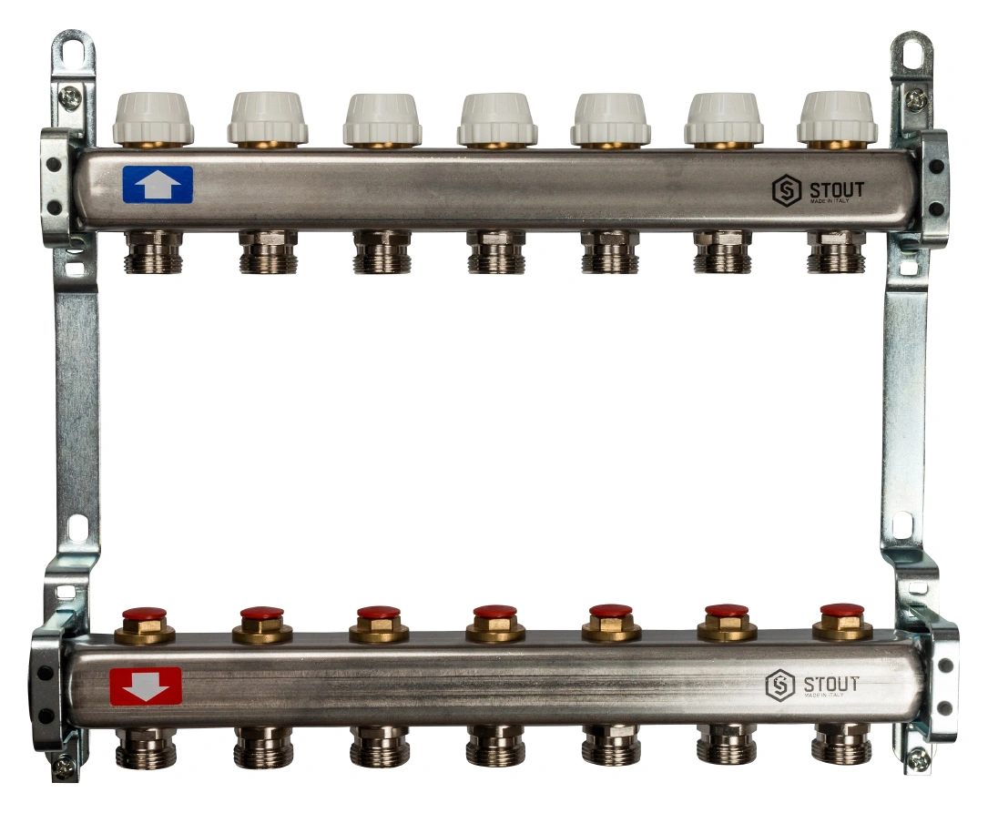 Инженерный распределительный узел для систем водоснабжения и отопления. Коллектор из нержавеющей стали STOUT создан для эффективного распределения потоков теплоносителя или воды по нескольким независимым контурам, например, в системе "теплый пол" или при подключении сантехнических приборов.