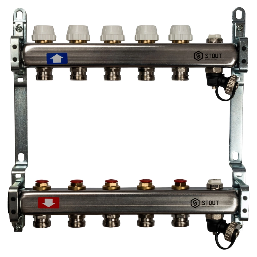 Коллектор Stout из нержавеющей стали с запорными кранами с клапаном вып. воздуха и сливом 5 выходов