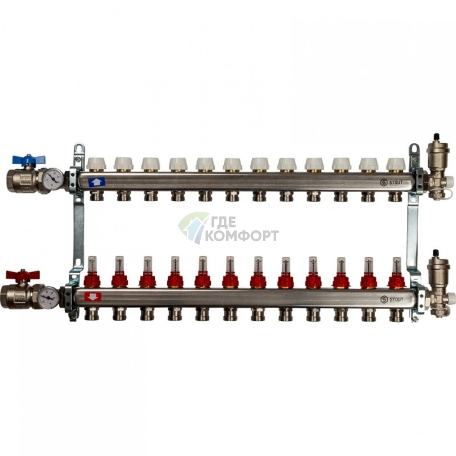Коллекторная группа в сборе из нержавеющей стали STOUT на 12 выходов с расходомерами