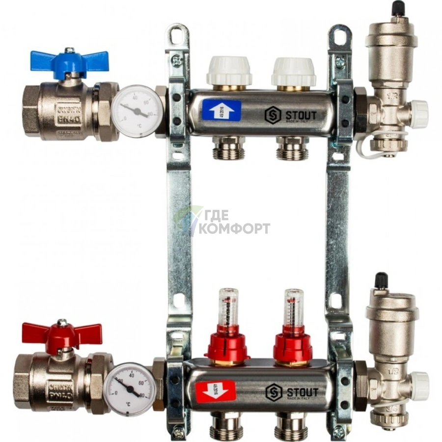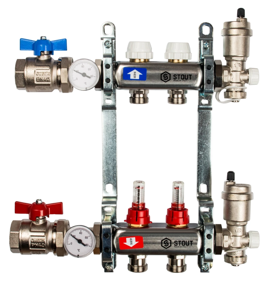 Коллекторная группа в сборе из нержавеющей стали STOUT с двумя выходами и встроенными расходомерами - готовое решение для организации лучевой разводки систем отопления или теплого пола. Она обеспечивает равномерный нагрев всех контуров и позволяет гибко управлять потоками теплоносителя.