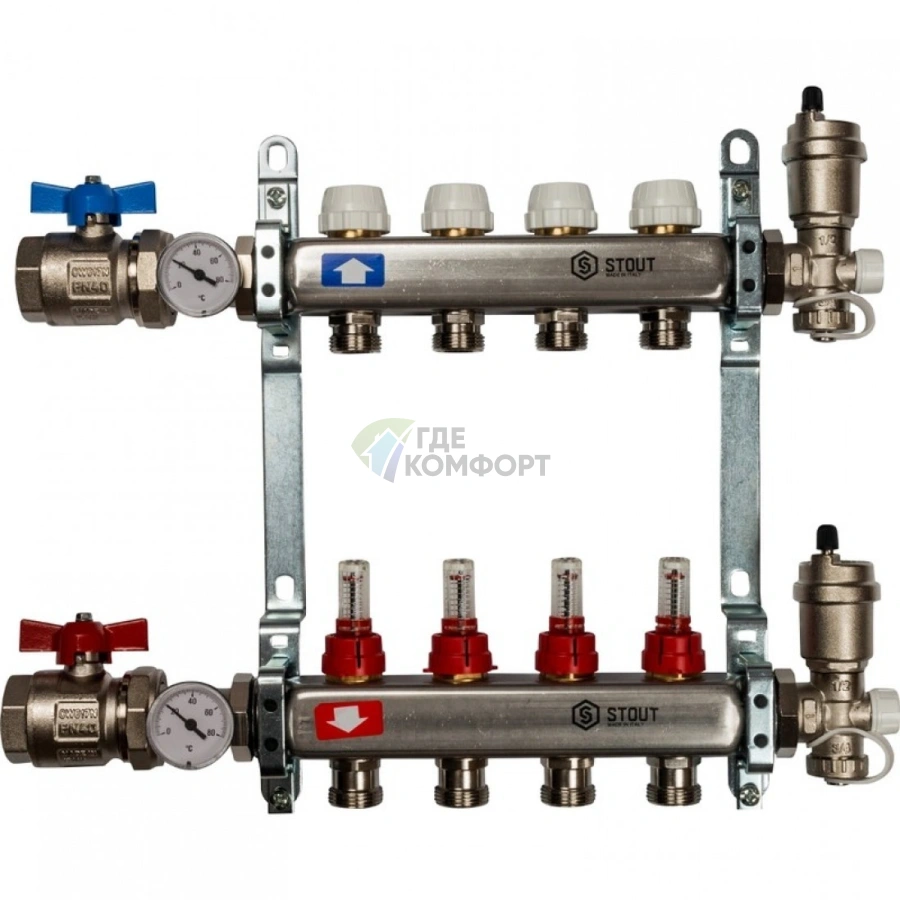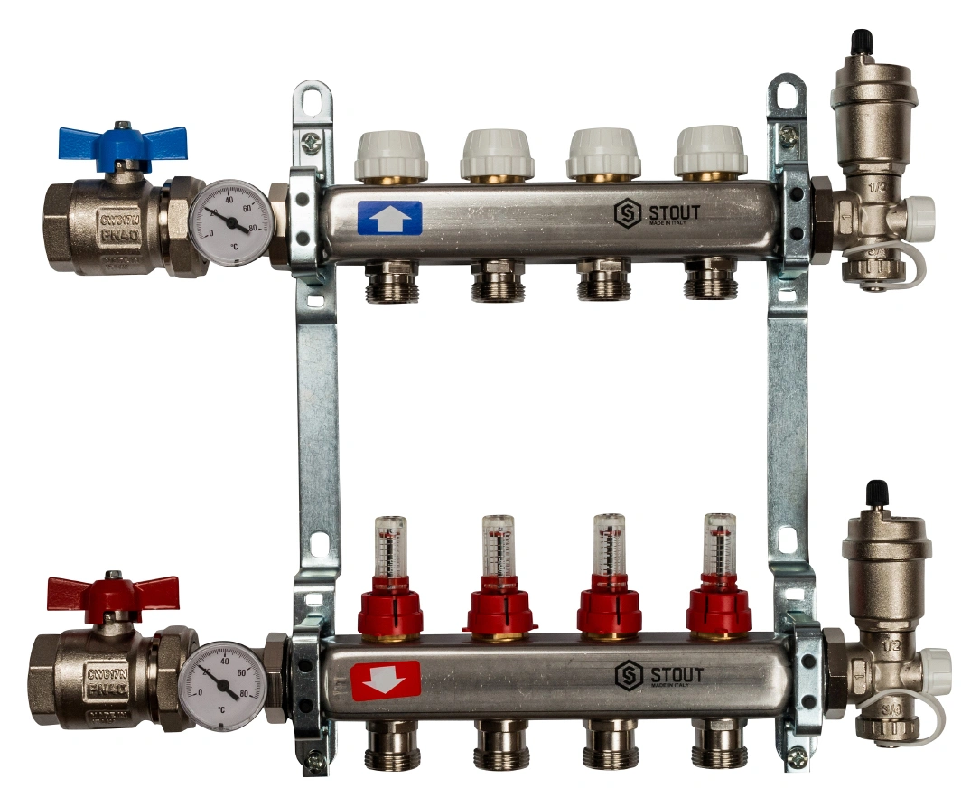 Как правило, в базовую комплектацию коллекторной группы в сборе STOUT входят сам коллектор с расходомерами, запорные шаровые краны на подающей и обратной гребенке, а также заглушки и кронштейны для настенного монтажа. Рекомендуем уточнять полный перечень комплектующих для конкретной модели.