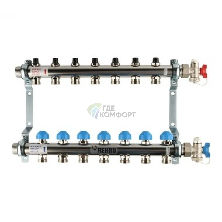 Коллекторная группа REHAU HKV на 7 выходов (РЕХАУ - 12180711001)1x3/4ЕК из нержавеющей стали с регулирующими и термостатическими вентилям