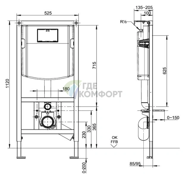 - Габариты инсталляционной рамы: компактные, для монтажа в перегородку или фальш-стену.