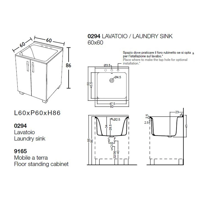 В комплект входит все необходимое для установки: база (тумба) размером 60х60 см, раковина KERASAN Aquadom без отверстия под смеситель (с одним намеченным местом для врезки) и выпуск с сифоном в цвете rovere chiaro. Это готовое решение для обустройства функциональной зоны в прачечной, подсобном помещении или гладильной.