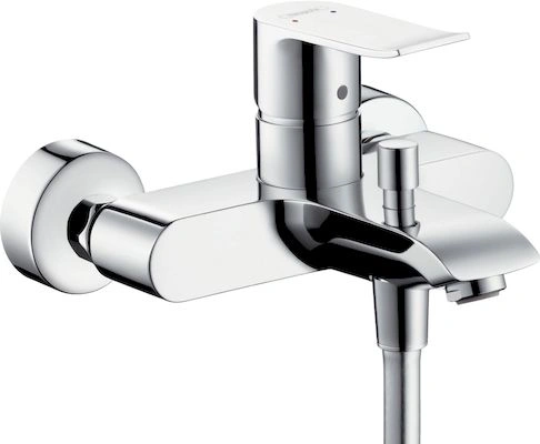- Смеситель для ванны с душем Metris: оснащен удобным переключателем «ванна-душ» и длинным шлангом. Эргономичная рукоятка обеспечивает плавную регулировку температуры и напора воды.