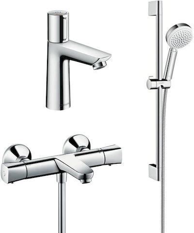 В комплект входят два самостоятельных устройства: термостатический смеситель для ванны Ecostat Universal и настенный смеситель для раковины Talis Select E. Это готовое решение для полного оснащения ванной комнаты от ведущего немецкого бренда.