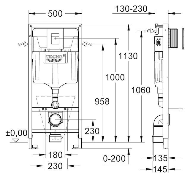 - Инсталляция GROHE Rapid SL 4 в 1: металлическая рама регулируемой высоты, выдерживает нагрузку до 400 кг. В комплекте бачок на 4,5/3 литра с технологией QuickFix для ускоренного монтажа.