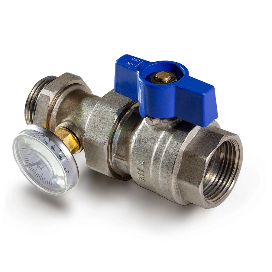 Данный комплект изготовлен из качественной латуни, что обеспечивает длительный срок службы и устойчивость к коррозии. Шаровая пробка гарантирует плавное и полное перекрытие потока среды. Термометр, установленный в корпус крана, имеет наглядную шкалу для оперативного снятия показаний.