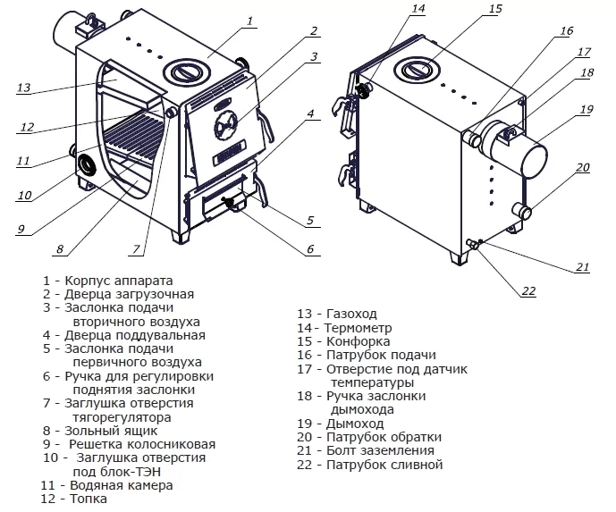 Мощность 12 кВт эффективно обогреет до 120 м². КПД 85% достигается за счет продуманной конструкции, что гарантирует экономный расход дров и угля.