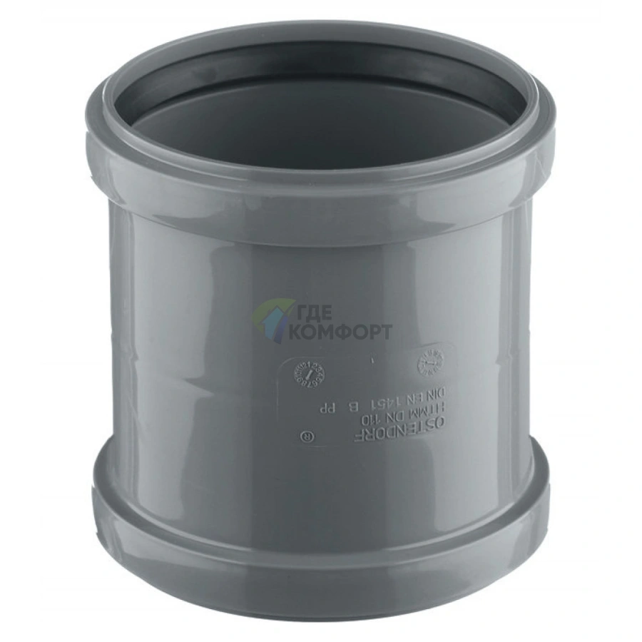 Данная компрессионная муфта занимает ключевое место в линейке фитингов Ostendorf для монтажа безнапорных трубопроводов. Она предназначена для надежного и быстрого соединения двух прямых участков канализационных труб одинакового диаметра в системах внутренней и наружной канализации.