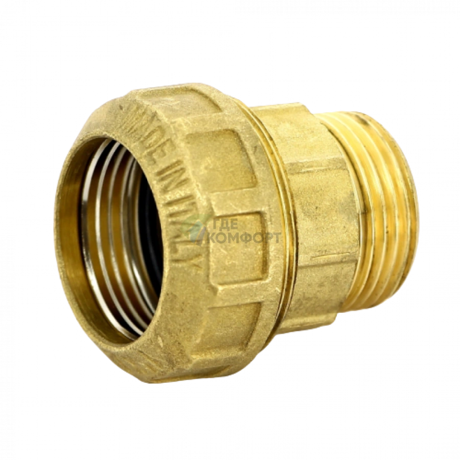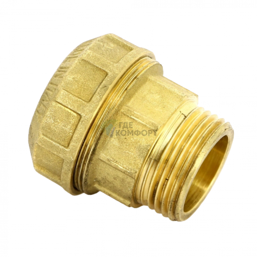 Эта муфта предназначена для быстрого и надежного соединения металлопластиковых труб без сварки и пайки. Это ключевой фитинг для создания разборных соединений в системах отопления и водоснабжения. Она позволяет подключить трубу к оборудованию или другому фитингу с наружной резьбой 1 дюйм, обеспечивая герметичный стык за счет обжимного кольца.