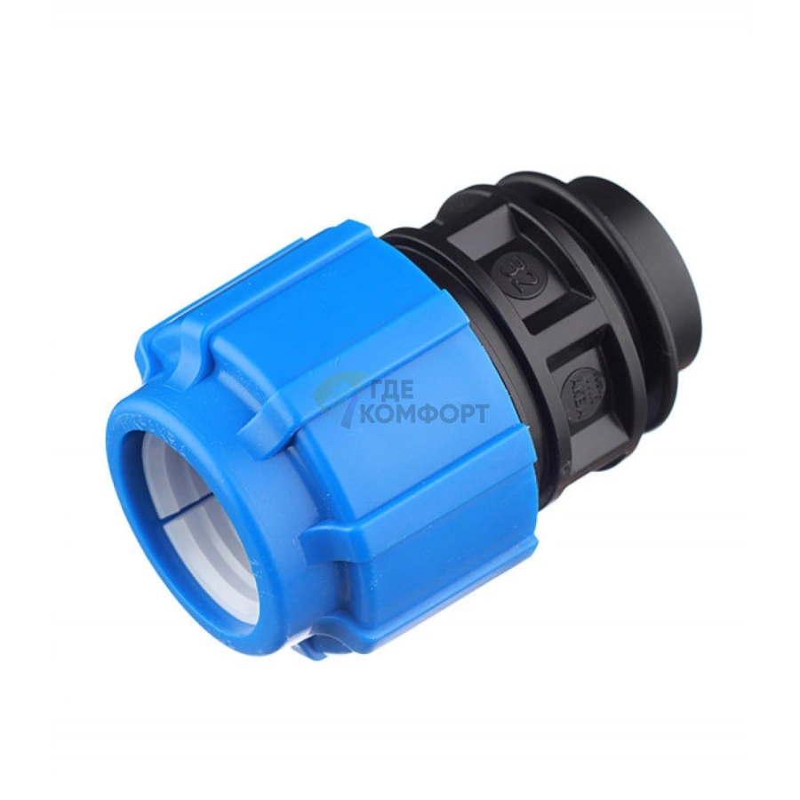 Эта муфта предназначена для надёжного перехода с полиэтиленовой трубы ПНД на оборудование с металлической резьбой. Она позволяет подключить трубу диаметром 32 мм к стандартным сантехническим приборам, арматуре или трубам с внешней резьбой 3/4 дюйма. Чаще всего ее используют для подключения к водопроводным кранам, счетчикам воды, бойлерам, фильтрам или участкам стальной магистрали в системах холодного водоснабжения, полива или орошения.