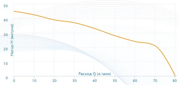 - Максимальный напор: 45 метров, позволяет поднимать воду с глубоких скважин и обеспечивать давление на верхних этажах.