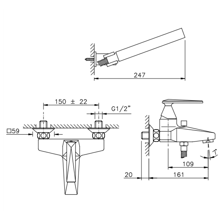 Этот смеситель представляет собой классическое настенное решение. В собранном виде он поставляется вместе с душевой лейкой на кронштейне, гибким шлангом и необходимым комплектом для монтажа. Излив смесителя имеет достаточную длину и высоту для удобного набора воды в глубокую ванну.