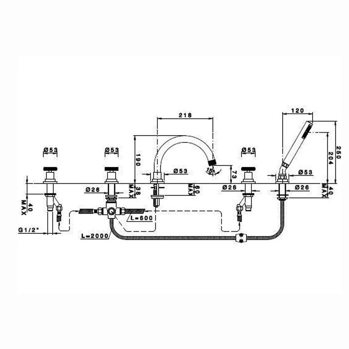 Данная модель разработана для стандартного монтажа на 5 отверстий в борту ванны или на специальной инсталляции. Поворотный излив длиной 21,8 см обеспечивает удобное направление воды и оптимальную высоту для наполнения ванны. Все функциональные элементы - два вентиля для раздельного управления горячей и холодной водой, переключатель «душ-излив» и держатель для душевой лейки - расположены логично и эргономично.
