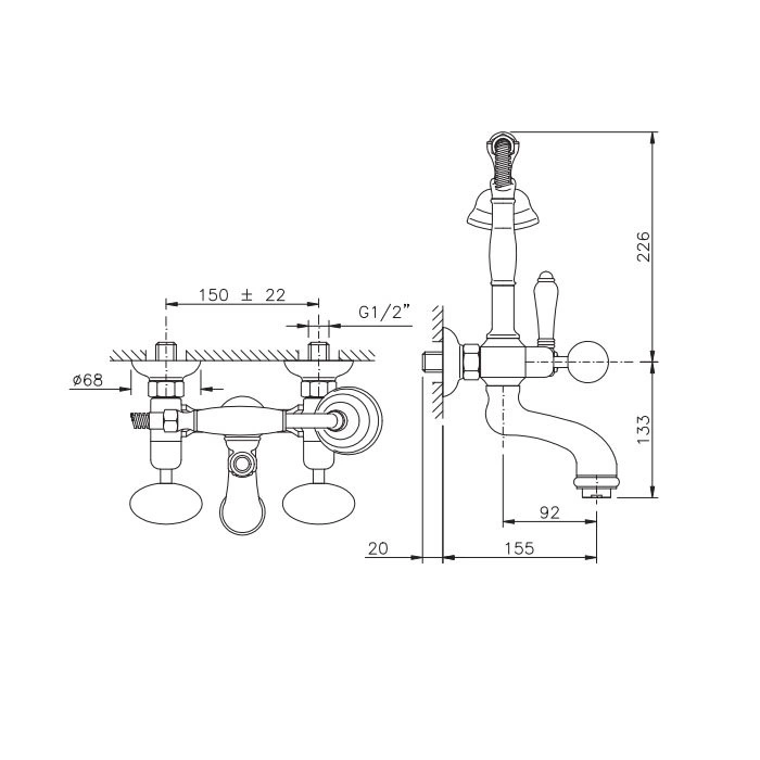 - Конструкция: для ванны с двумя ручками и переключателем душ/ванна.