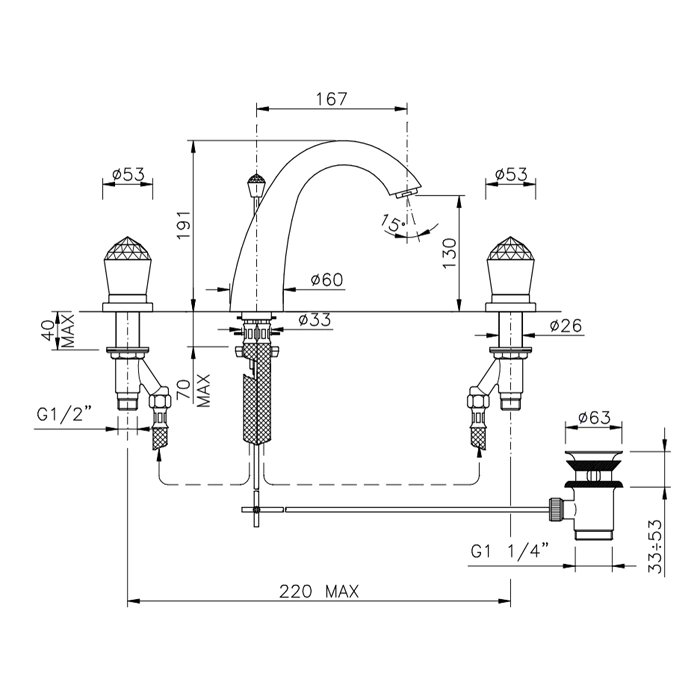 Смеситель для раковины Nicolazzi Cristallo на 3 отверстия с донным клапаном