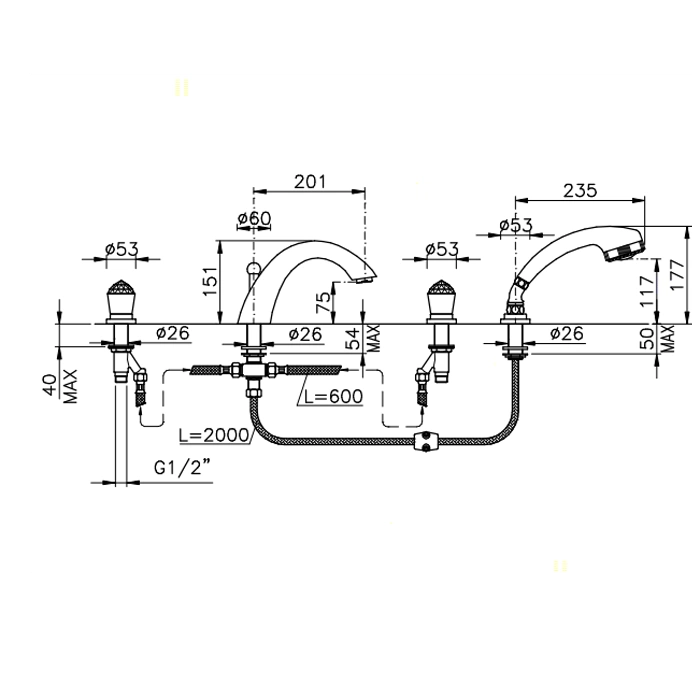 Данная модель предназначена для раздельного монтажа на бортик ванны или на специальную консоль. Классическая компоновка на четыре отверстия предполагает раздельную установку излива, двух маховиков или рукояток управления, и отдельного отверстия для переключателя на душ. Такая схема предлагает проверенную временем надежность и облегчает обслуживание.