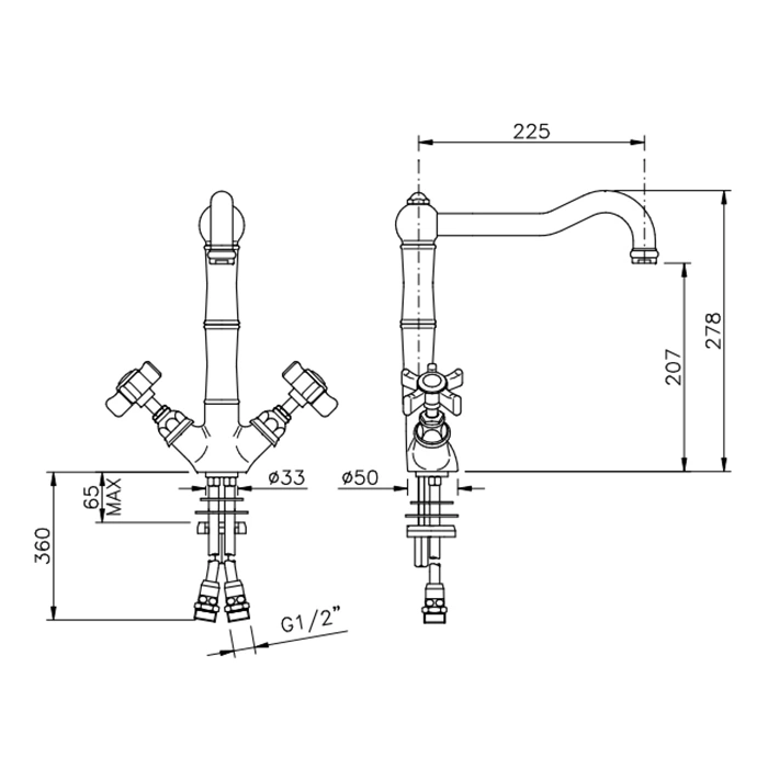 Длина излива составляет 225 мм, что является оптимальным для большинства раковин. Такой размер обеспечивает достаточный вынос для комфортного мытья рук или крупной посуды, при этом смеситель не загромождает пространство умывальника. Высота излива также продумана для удобного подхода.
