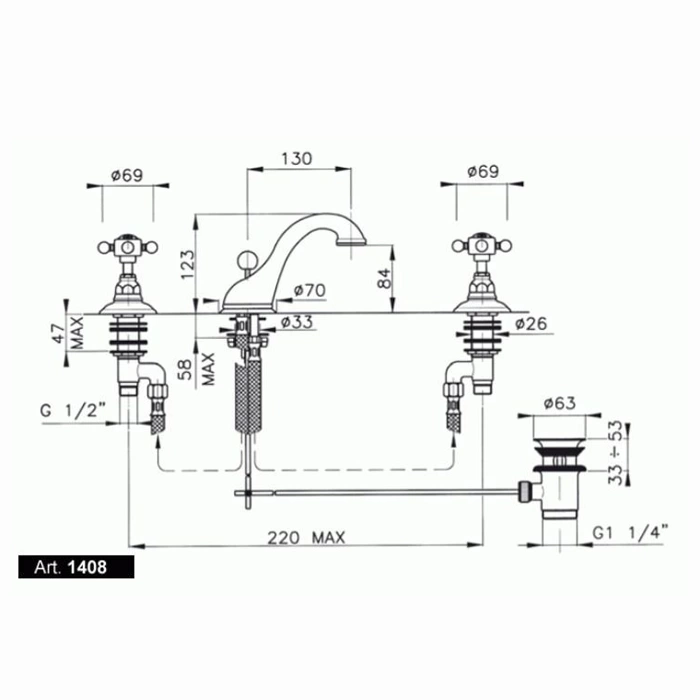 Модель 1408DB18 разработана для установки в раковину с тремя монтажными отверстиями (стандартное межосевое расстояние 102 мм). Высота излива составляет 130 мм, что оптимально для комфортного мытья рук и наполнения глубоких ёмкостей. В комплектацию входит необходимый для сборки донный клапан, позволяющий перекрывать сливное отверстие раковины.