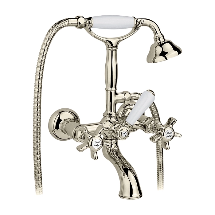 Смеситель для ванны Nicolazzi Dames Anglaises с ручным душем на 2 отверстия, белые керамические ручки, полированный никель (1401NL18)