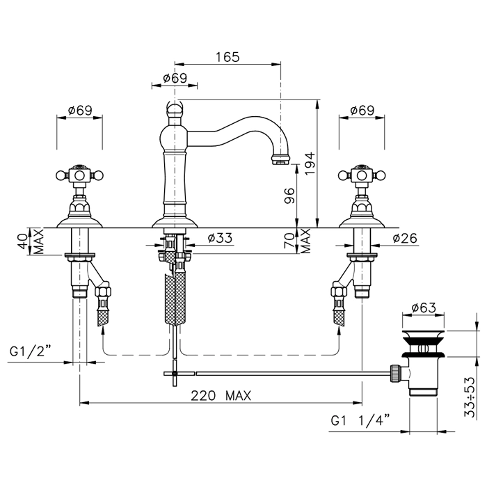Смеситель для раковины Nicolazzi на 3 отверстия (1409CR93) спроектирован для простого и быстрого монтажа. Комплектация включает все необходимые элементы для подключения: эксцентрики, гибкие подводки, декоративные чашки и крепеж. Устройство подходит для систем с давлением до 10 атмосфер и работает в стандартном температурном диапазоне. Эргономичные маховики с интуитивными метками облегчают точную настройку напора и температуры.