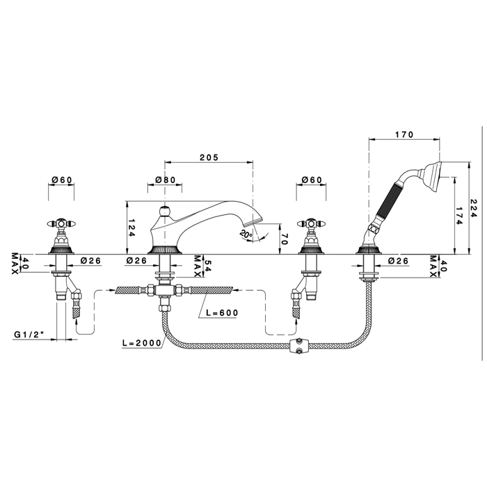 Смеситель для ванны Nicolazzi Impero с ручным душем, 4 отверстия, хром (1204CR36L)