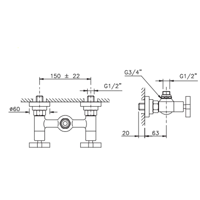 Этот двухрукояточный смеситель создан для настенного монтажа с верхним подводом воды. Такая схема установки часто предпочтительна при замене старой арматуры или для удобства скрытия коммуникаций.