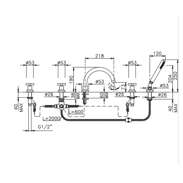 Смеситель для ванны Nicolazzi M.Croce на борт с ручным душем, 5 отверстий, хром, излив 218 мм (2214CR27)