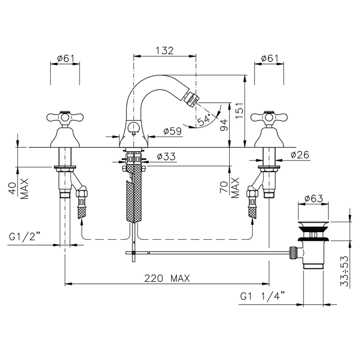 Смеситель для биде Nicolazzi Nuova Brenta на 3 отверстия с донным клапаном, излив 132 мм, цвет бронза (2515BZ)