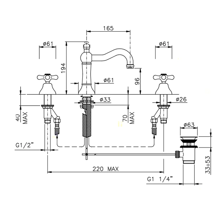 Смеситель для раковины Nicolazzi Nuova Brenta на 3 отверстия с донным клапаном в бронзе