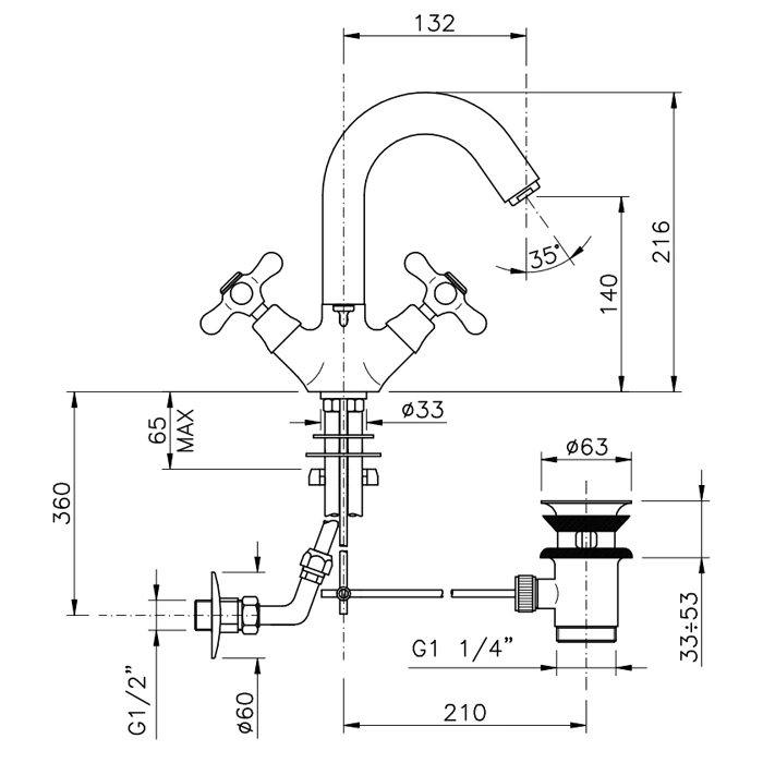 Двухрукояточная система управления (два вентиля) позволяет тонко и независимо регулировать температуру и напор воды. Это классический, интуитивно понятный и надежный механизм. Установленный в комплекте донный клапан (слив-перелив) для раковины решает сразу две задачи: обеспечивает быстрый слив воды и защищает от переполнения чаши. Вся система визуально гармонирует, создавая целостный и аккуратный образ.