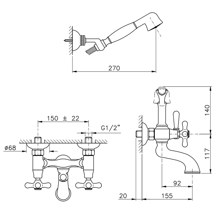 Смеситель для ванны Nicolazzi Nuova Brenta: настенный с двумя ручками и душевой лейкой, хром (2502CR)