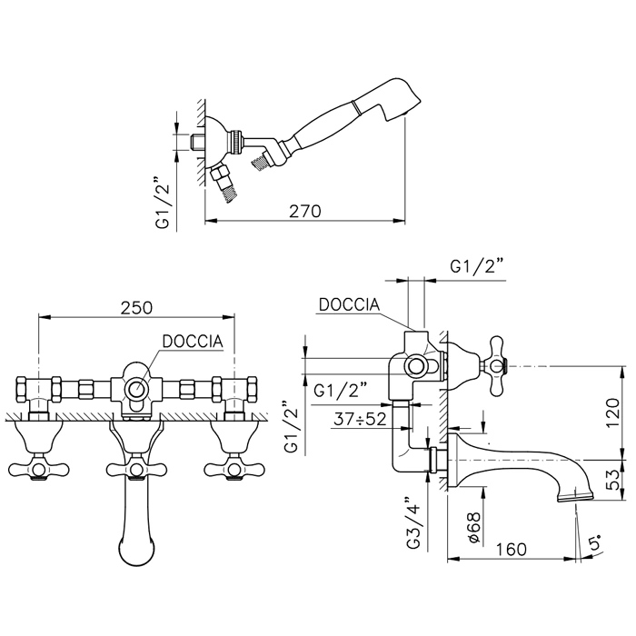 Встраиваемый трехвентильный смеситель для ванны Nicolazzi Nuova Brenta с душевой лейкой, хром (2503CR)
