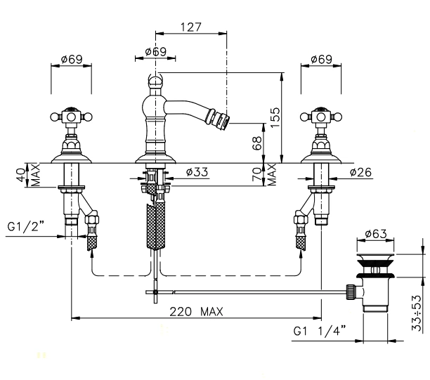 Модель предназначена для установки на борт биде или раковины с тремя монтажными отверстиями. Такая конструкция обеспечивает стабильное крепление и классический внешний вид. Донный клапан в комплекте позволяет оперативно перекрывать и сливать воду, что отвечает современным требованиям к экономии ресурсов и удобству.