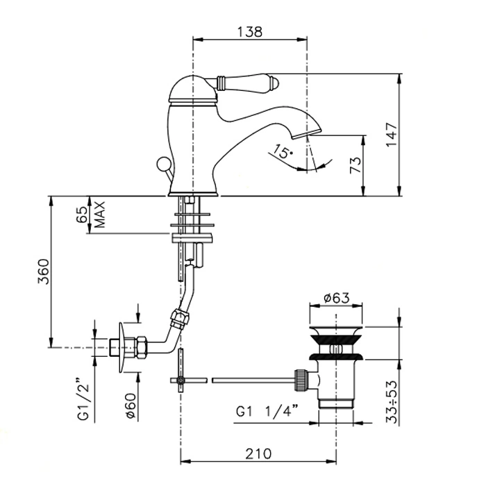 Основу смесителя составляет прочный корпус из качественной латуни, что гарантирует устойчивость к коррозии и долгий срок службы. Декоративное покрытие - износостойкая бронза - придает изделию благородный классический облик. Излив и рычаг управления выполнены в элегантной форме, обеспечивая комфортное использование.
