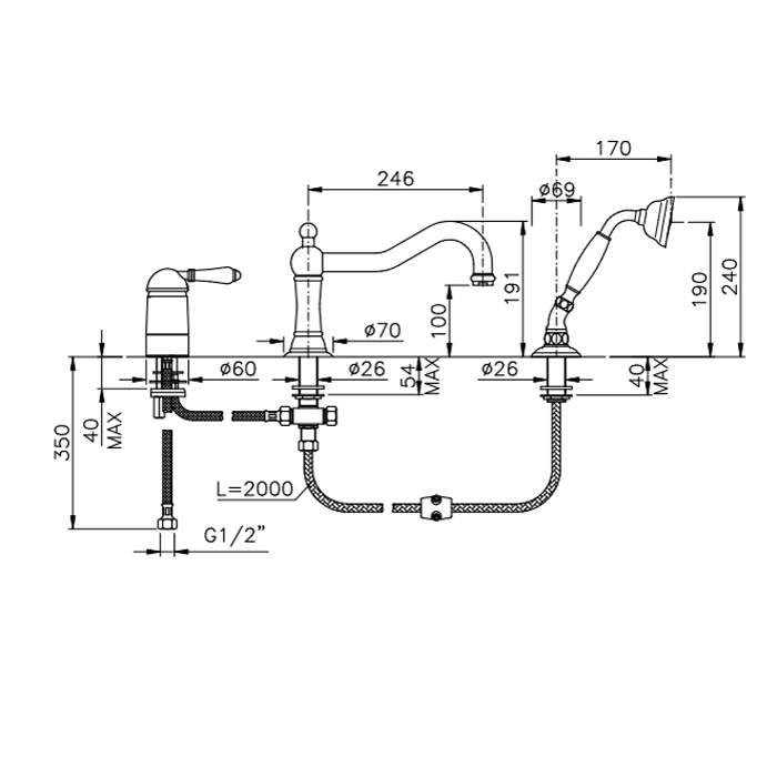 Смеситель Nicolazzi P.m. Blanc предназначен для стандартного подключения к системам горячего и холодного водоснабжения. Расстояние между подводками (центры отверстий) составляет 150 мм - это самый распространенный стандарт для ванн. Перед покупкой проверьте этот параметр у своей сантехники.