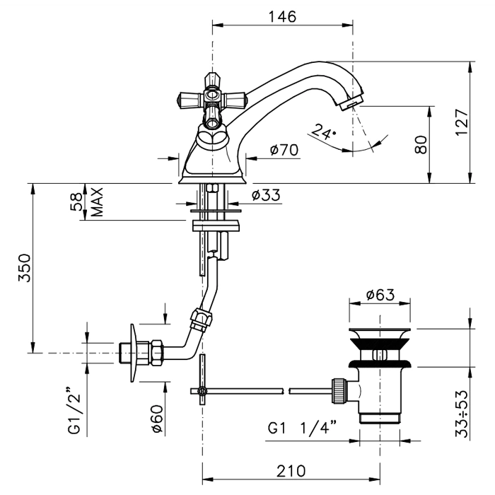 Комплектация включает в себя донный клапан - обязательный элемент для раковины с системой перелива. Он надежно перекрывает сливное отверстие и позволяет набрать воду. Конструкция клапана продумана для простого монтажа и дальнейшего использования.