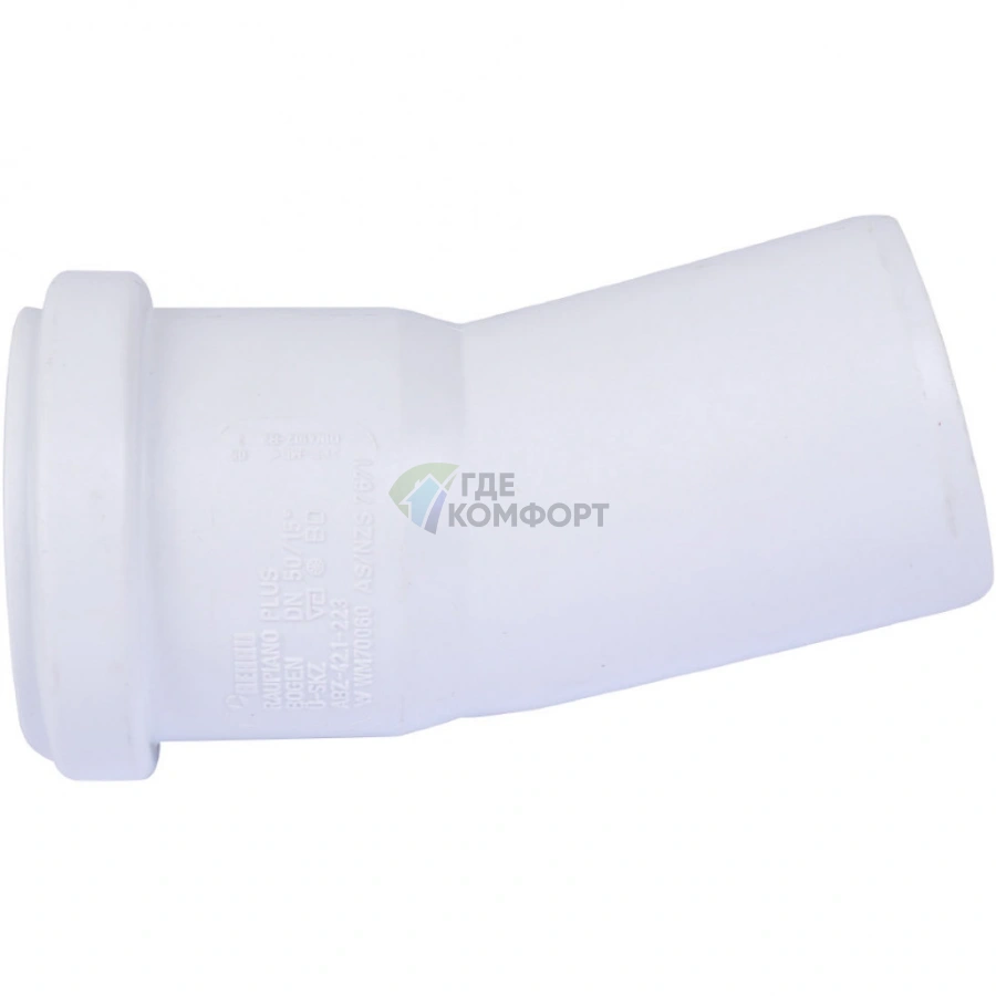 Маркировка расшифровывается просто: «50» — это диаметр присоединяемой трубы в миллиметрах, а «15°» — угол поворота отвода. Таким образом, этот фитинг плавно изменяет направление трубопровода на 15 градусов при диаметре 50 мм.