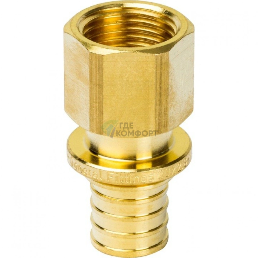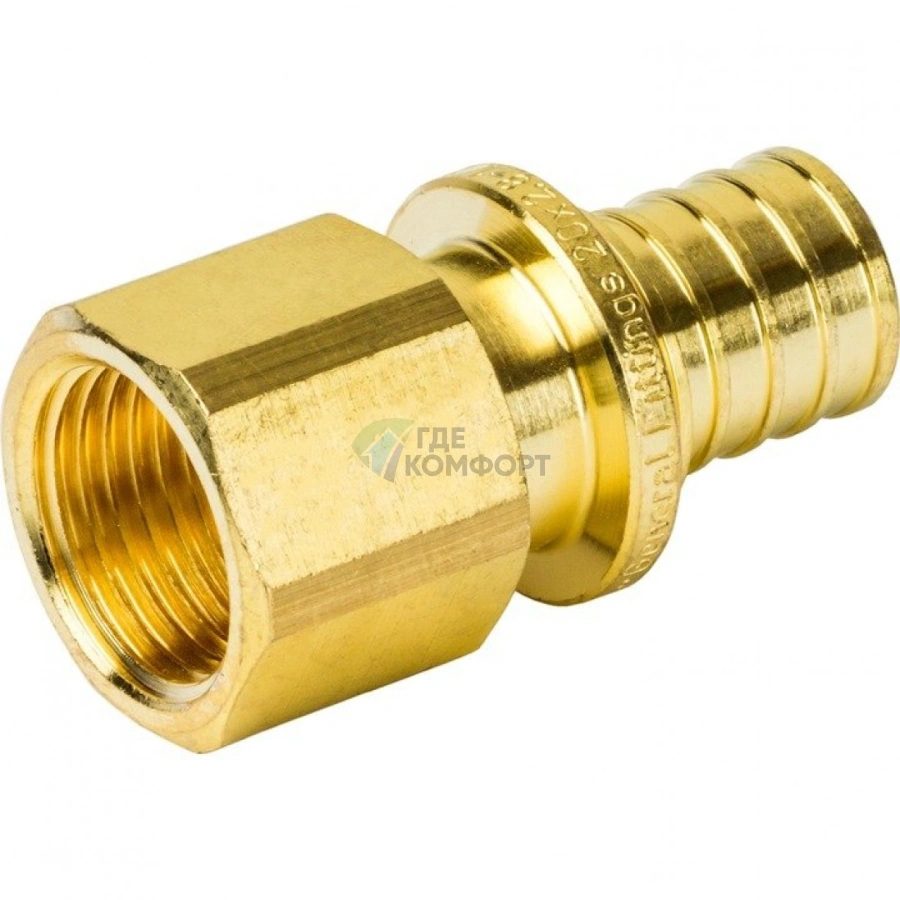 Переходник предназначен для надежного соединения трубы из сшитого полиэтилена (PEX-трубы) диаметром 20 мм с оборудованием или арматурой, имеющей внутреннюю резьбу G1/2" (полдюйма). Он часто используется для подключения к смесителям, водорозеткам, счетчикам воды или другой сантехнической фурнитуре.
