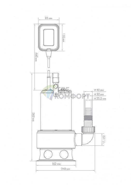 Устройство автоматически включается и отключается благодаря встроенному поплавковому выключателю, защищающему от работы «на сухую». Это делает эксплуатацию простой и безопасной.
