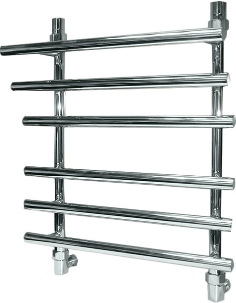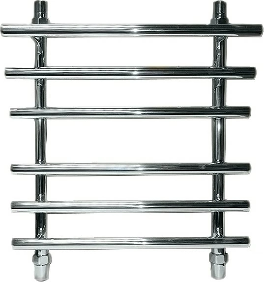 Основу устройства составляет прочный контур из нержавеющей стали, устойчивой к коррозии и механическим воздействиям. Классическая форма «лесенки» с горизонтальными перекладинами оптимальна для размещения нескольких полотенец одновременно.