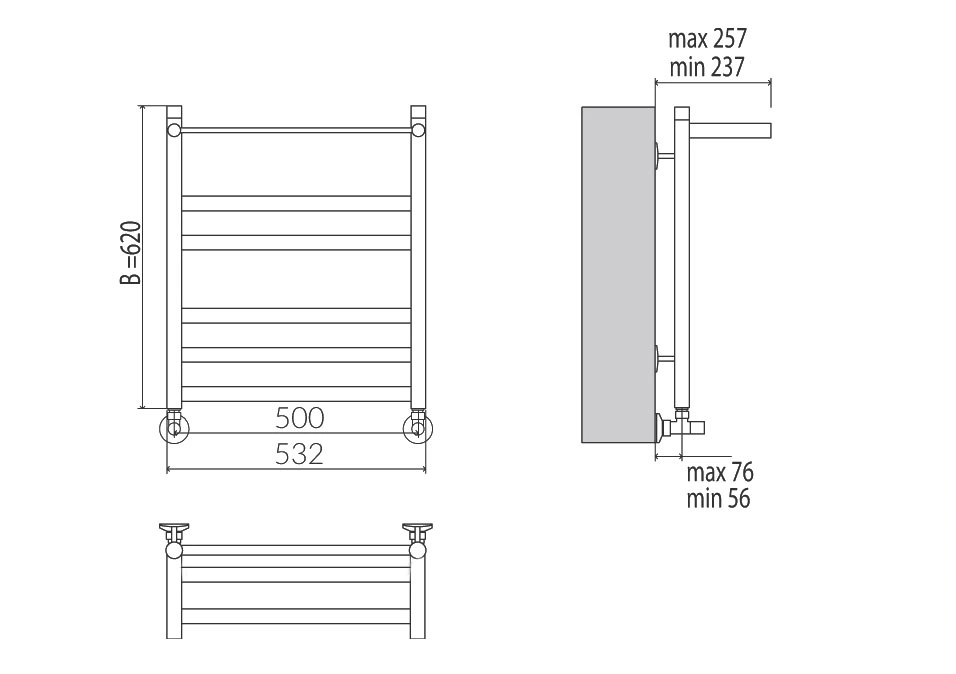 Модель совместима со стандартными стояками отопления и водоснабжения, а боковая подводка позволяет легко вписать ее в готовую разводку труб. Для монтажа потребуются стандартные фитинги и крепежные кронштейны, которые можно подобрать отдельно.