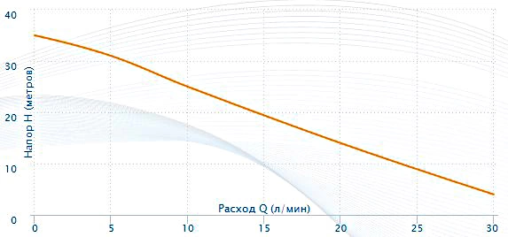 - Напор (высота подъема): до 35 метров гарантирует подачу воды из колодца или скважины с неглубоким зеркалом воды.