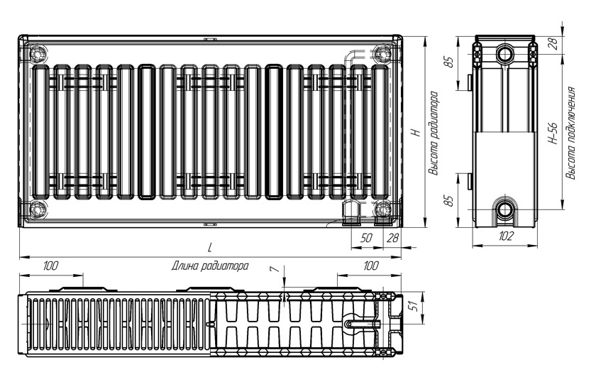 Модель относится к типу 22: состоит из двух конвективных панелей и двух рядов оребрения, что обеспечивает высокую теплоотдачу за счет конвекции и теплового излучения. Стальные панели толщиной 1,25 мм изготовлены методом штамповки и сварены в герметичный блок, готовый к установке.