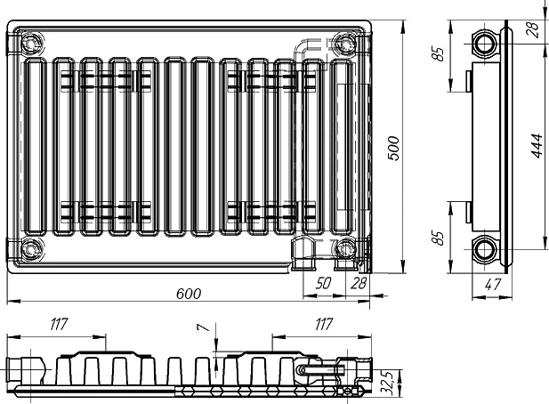 Конструктивно радиатор Лидея ЛУ 11-506 представляет собой цельногнутую стальную панель типа 11 с одним конвекционным оребрением. Нижнее подключение труб подачи и обратки интегрировано в боковые элементы, что позволяет аккуратно скрыть коммуникации.