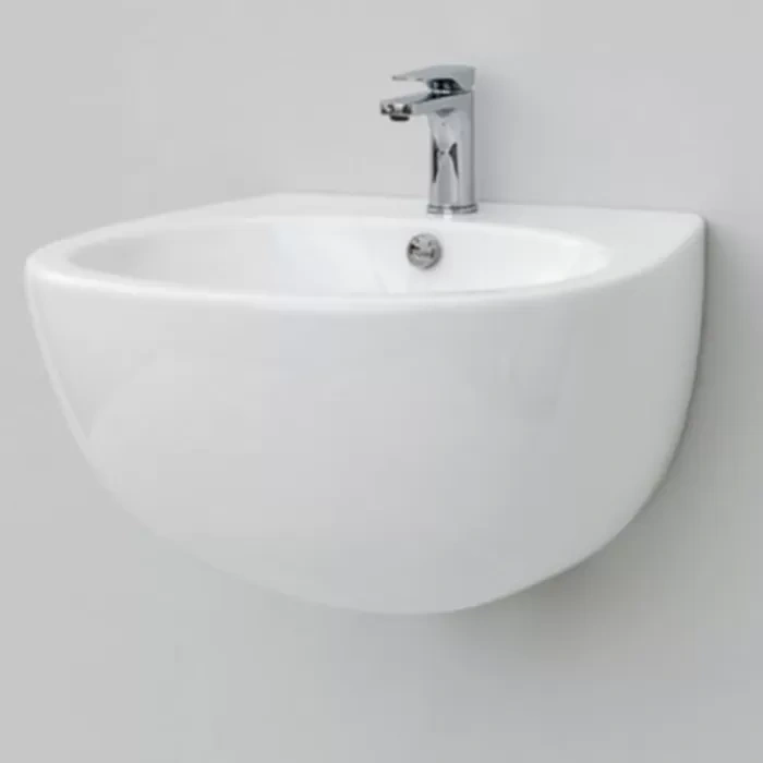 Стандартный сифон скрыт под чашей, не нарушая эстетику. Раковина совместима с большинством современных настенных и напольных смесителей для ванной комнаты.